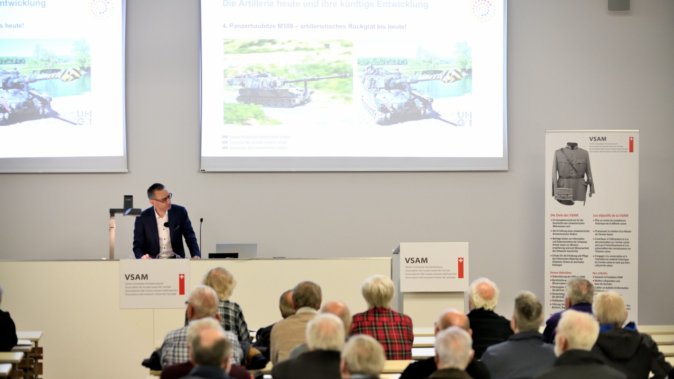 Die Ausrüstung der Schweizer Artillerie wurde vernachlässigt, bis der Ukraine-Krieg deren Bedeutung sichtbar werden liess. Oberst i Gst Stefan Holenstein machte in seinem Referat beim Verein Schweizer Armeemuseum (VSAM) klar, dass schwere Waffen durchaus eine Zukunft haben.